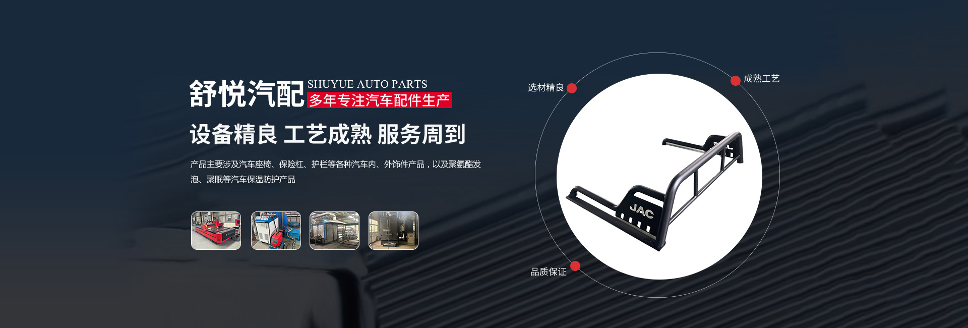揚州舒悅汽配有限公司經(jīng)過多年的穩(wěn)定發(fā)展,業(yè)績一直蒸蒸日上。公司產(chǎn)品主要涉及汽車座椅、保險杠、護欄等各種汽車內(nèi)、外飾件產(chǎn)品,以及聚氨酯發(fā)泡、聚脲等汽車保溫防護產(chǎn)品。其主要是為江淮、金龍,奇瑞等公司服務,已連續(xù)多年成為江淮、金龍等公司的A級供應商。        公司成立于1997年,現(xiàn)坐落于揚州市儀征劉集盤古工業(yè)集中區(qū)202號,公司占地面積26640平 方米,廠房建筑面積18512平方米。公司擁有先進的制造設備、可靠的生產(chǎn)工藝、完善的檢測手段和科學的管理,在售前和售后服務中做到快速反應,應急應變,為客戶提供優(yōu)良產(chǎn)品和滿意服務。公司的產(chǎn)品開發(fā)能力和生產(chǎn)規(guī)模在同行業(yè)中處于前列的地位。        揚州舒悅?cè)吮小罢\信雙嬴”的原則,發(fā)揚“誠信、務實、創(chuàng)新、貢獻”的企業(yè)精神,恪守“顧客至上”的經(jīng)營宗旨,致精從業(yè),不斷引進新技術(shù)、新材料。以優(yōu)良的產(chǎn)品、合理的價格和周到的服務參與市場競爭。公司愿與國內(nèi)外朋友建立真誠的合作伙伴關(guān)系,攜手共創(chuàng)輝煌!